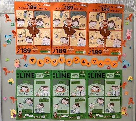 体罰等によらない子育てを広げるため、また、児童相談所虐待対応ダイヤル「189(いちはやく)」を一人でも多くの方に知っていただき、「児童虐待かも」と思ったら、ためらわずに通告していただけるようにと、市役所こども支援課横に「オレンジリボンキャンペーン」の掲示をしています。